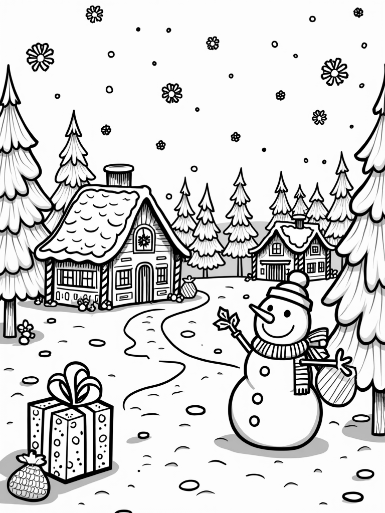 Follow the winding path made of colorful ornaments that leads to a snug cabin with smoke curling from its chimney. It looks like the perfect spot to warm up with some hot cocoa after a day of holiday fun. This scene is packed with joy and whimsy, perfect for coloring!