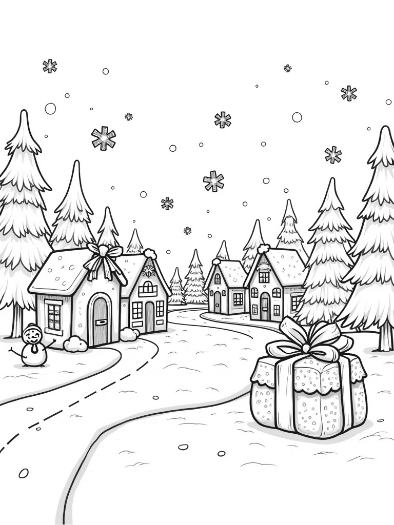 Check out this free, printable coloring page featuring a delightful winter village filled with gingerbread houses, a giant gift box, and a friendly snowman. Perfect for holiday fun, it’s a great way to spark creativity in kids!