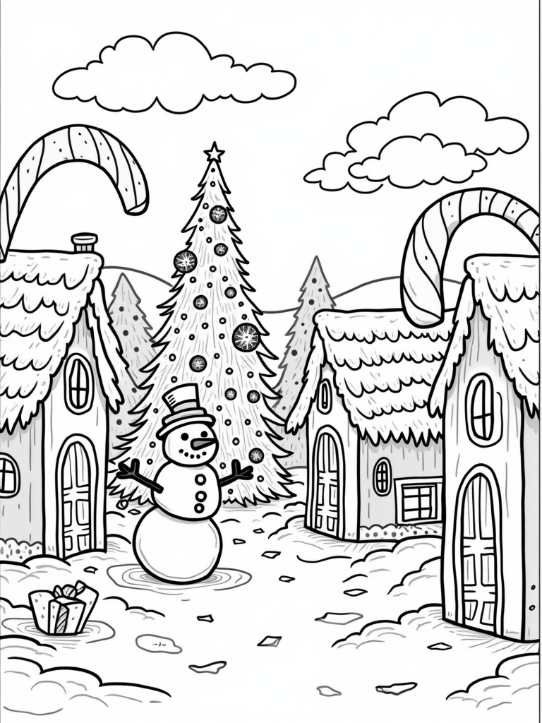 Gingerbread Village with Candy Canes and a Snowman Coloring Page