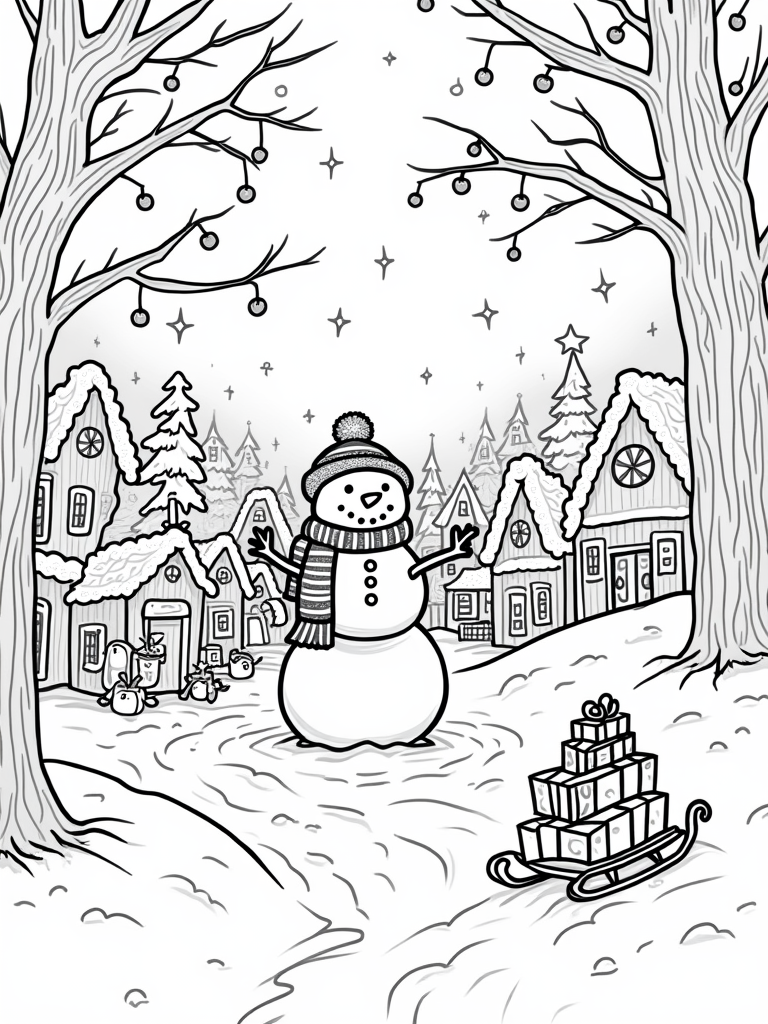 Gingerbread Village with Snowman and Penguins Coloring Page