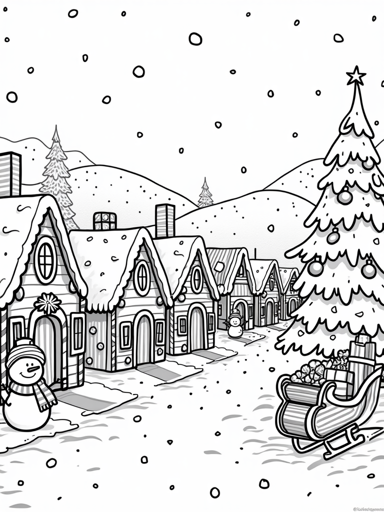 Picture a cozy winter village where snowflakes are dancing down like confetti! In this charming scene, a row of gingerbread houses stands proudly, each topped with delightful frosting roofs and candy cane chimneys. It’s like a sweet dream come to life! Right in the center, a gigantic Christmas tree sparkles with oversized ornaments, inviting everyone to gather around.