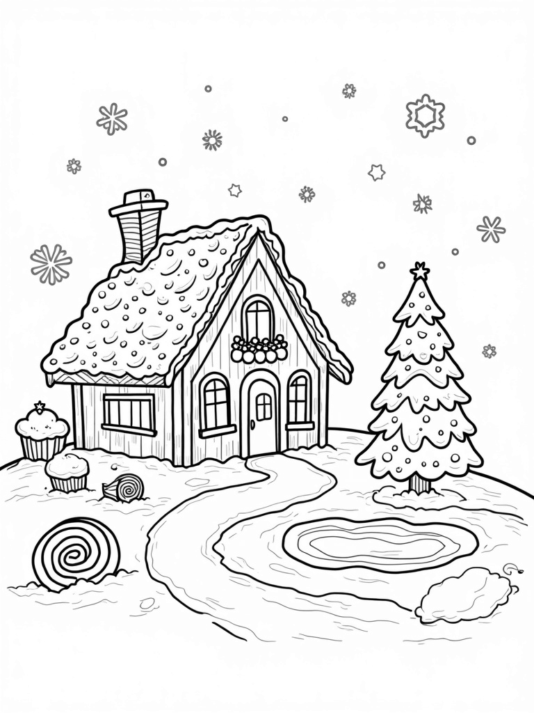 As you color in this page, don’t forget to add your own flair! The peppermint swirl path leads right to the bakery door, making it an inviting place for anyone with a sweet tooth. And just look at that giant cookie tree next to the frosted pond shaped like a snowflake! It’s a perfect spot for some holiday magic. Don't forget to color the falling snowflakes, some of which look like tiny ornaments!