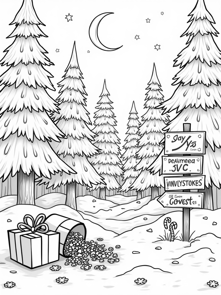 In the center of the forest, you'll find a giant gift box, wide open and overflowing with colorful ribbons and candy canes. Imagine how fun it would be to decorate this gift box with your favorite colors! It's the perfect spot for adding some sparkle and shine to your artwork, and who knows what surprises might be hiding inside?