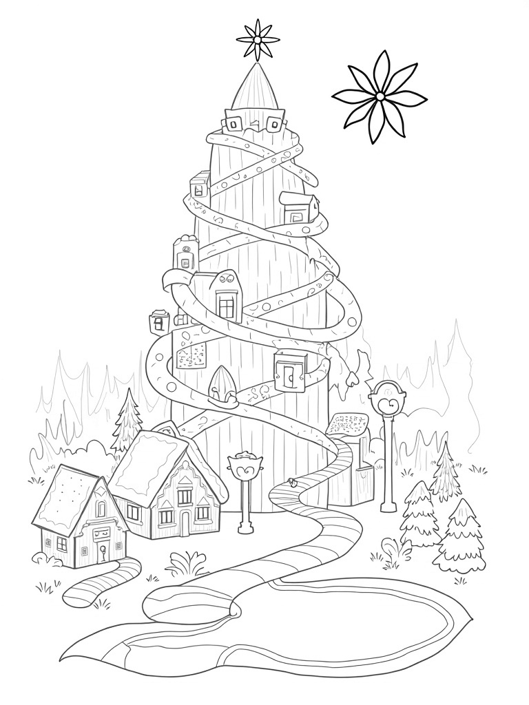 Picture a cozy little village perched high in the branches of a giant peppermint tree. The tree swirls with red and white stripes, creating a magical backdrop for gingerbread houses that line the winding pathways. Each house has its own unique frosting decorations, making them look like sweet treats straight out of a fairy tale. Candy cane lampposts light the way, casting a warm glow across the village.