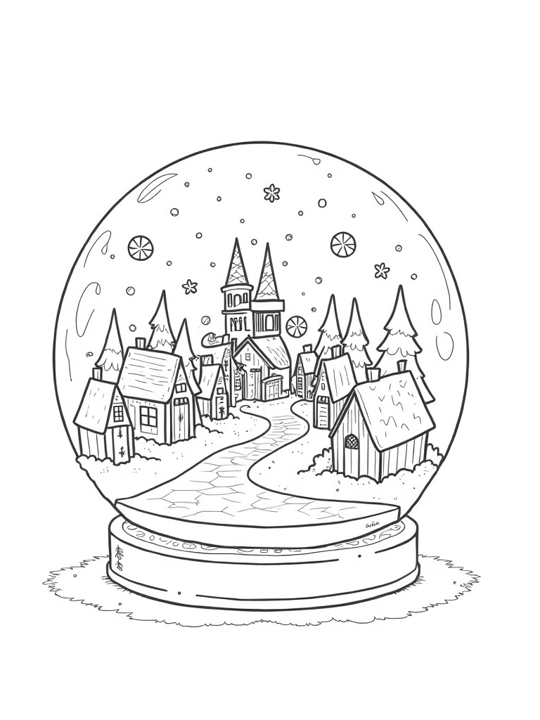At the heart of the village stands a towering gingerbread castle, inviting you to imagine all the delicious treats inside. A winding pathway leads you right to it, while fluffy snowflakes drift gently through the air, making everything look magical. The sparkling lights that circle the globe create playful shadows on the ground, making it the perfect scene to color in your favorite festive hues!