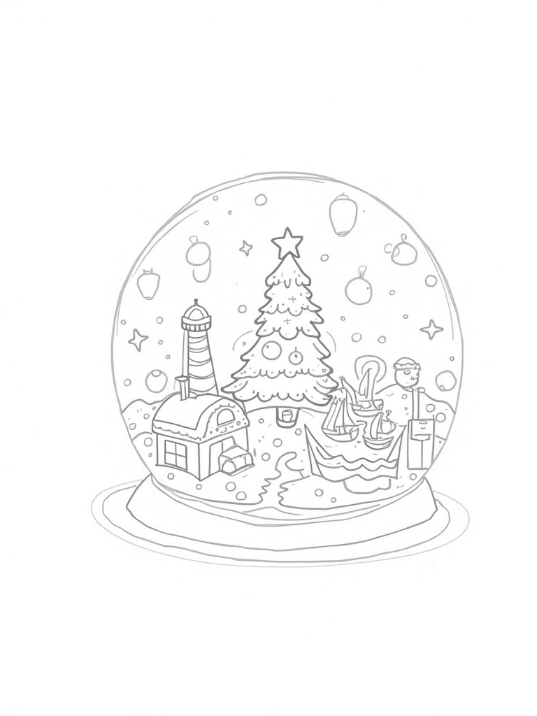 Enjoy this free, printable coloring page featuring a whimsical holiday village in a snow globe. Perfect for kids who love to color festive scenes full of gingerbread boats and a cozy cabin.