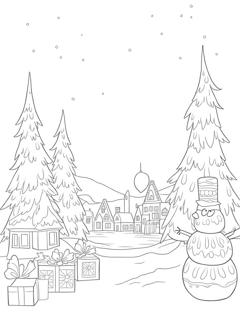 Check out this free, printable coloring page featuring a whimsical holiday village! With candy cane houses, gingerbread trees, and a colorful snowman, it's perfect for kids who love the holidays and coloring.