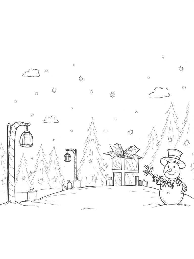 This coloring page showcases a charming holiday village set against a snowy backdrop. You’ll see towering candy cane lampposts lining the winding path, leading you through a scene filled with oversized ornaments hanging from frosted pine trees. At the heart of the village, there's a giant, beautifully designed gift box that’s just waiting to be colored in!