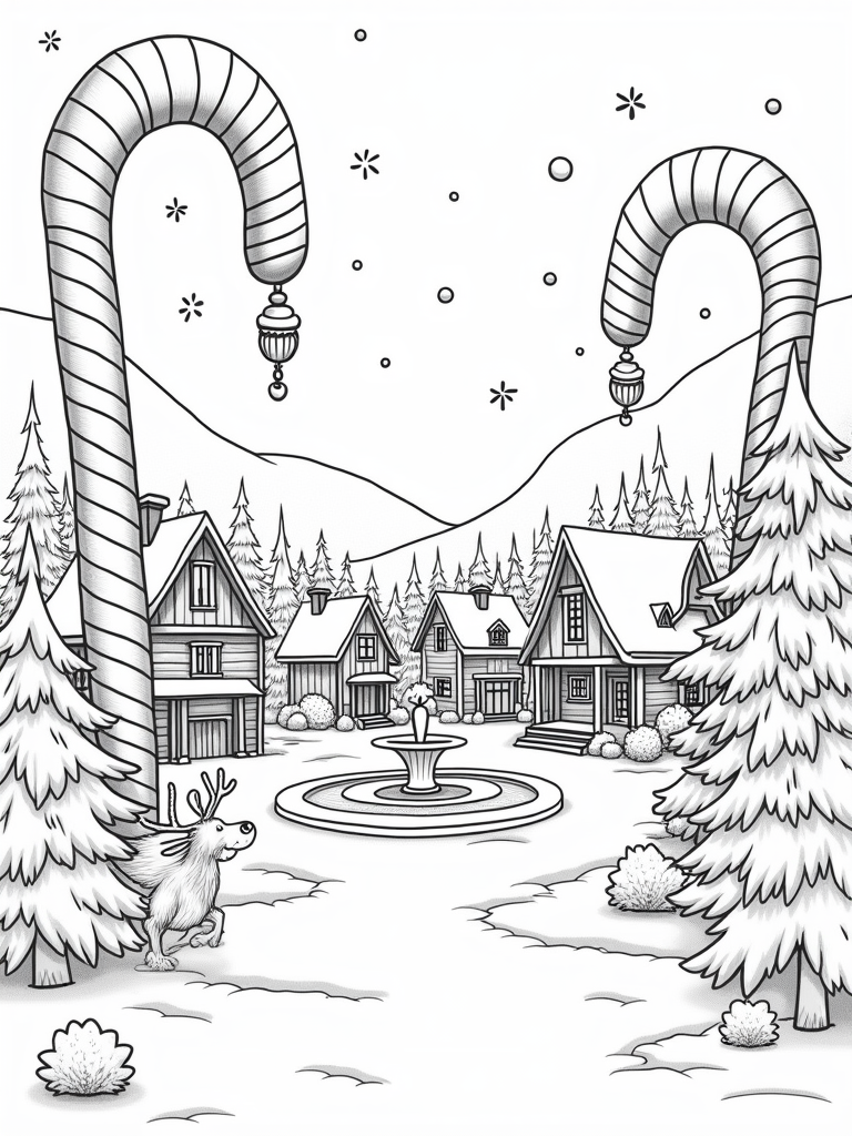 Celebrate the holidays with this free, printable coloring page featuring a whimsical village, candy canes, and a playful reindeer. Perfect for kids who love to color and get into the festive spirit!