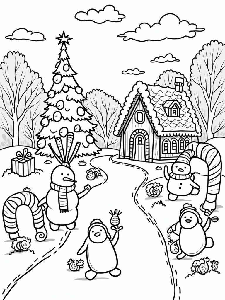 This coloring page brings to life a charming holiday village nestled in a cozy snowy landscape. Picture giant candy canes arching over winding paths that lead to a delightful gingerbread house, complete with oversized peppermint shingles that are sure to spark any child's imagination. In the village square, a towering Christmas tree shines brightly, decorated with big, colorful ornaments that would make anyone feel festive!