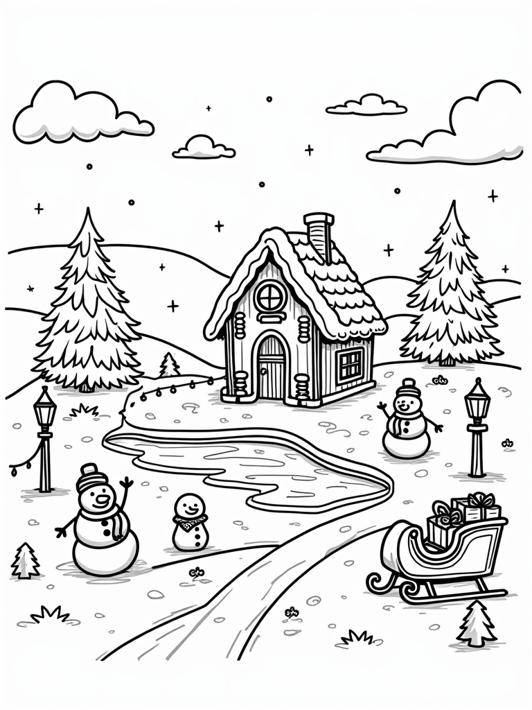 Holiday Village with Gingerbread House and Snowmen Coloring Page