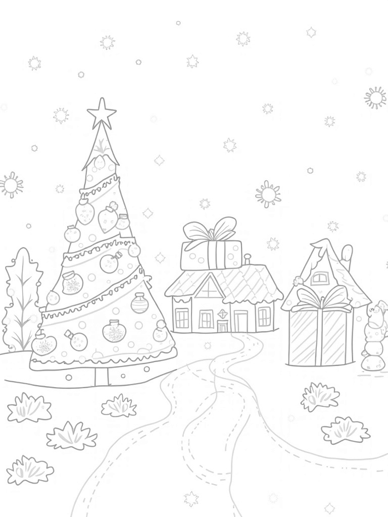 Holiday Village with Gingerbread Houses and a Christmas Tree Coloring Page