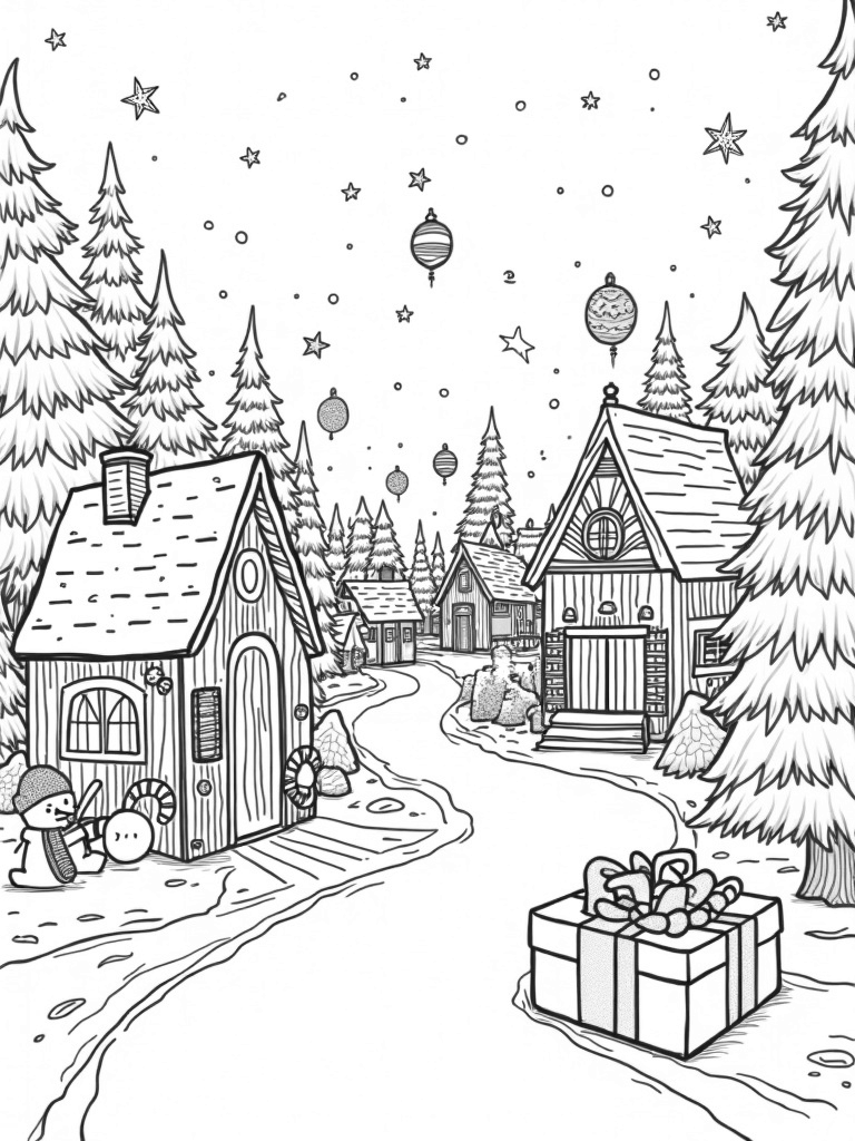 Look up and you'll spot oversized ornaments hanging from a sky filled with stars, creating a sparkling backdrop for your coloring. There's even a giant gift box that's open, letting colorful ribbons spill out and twist around the village. In the background, a frosted pine tree shines with decorations, making this holiday village feel extra special. Grab your favorite colors and bring this delightful scene to life!
