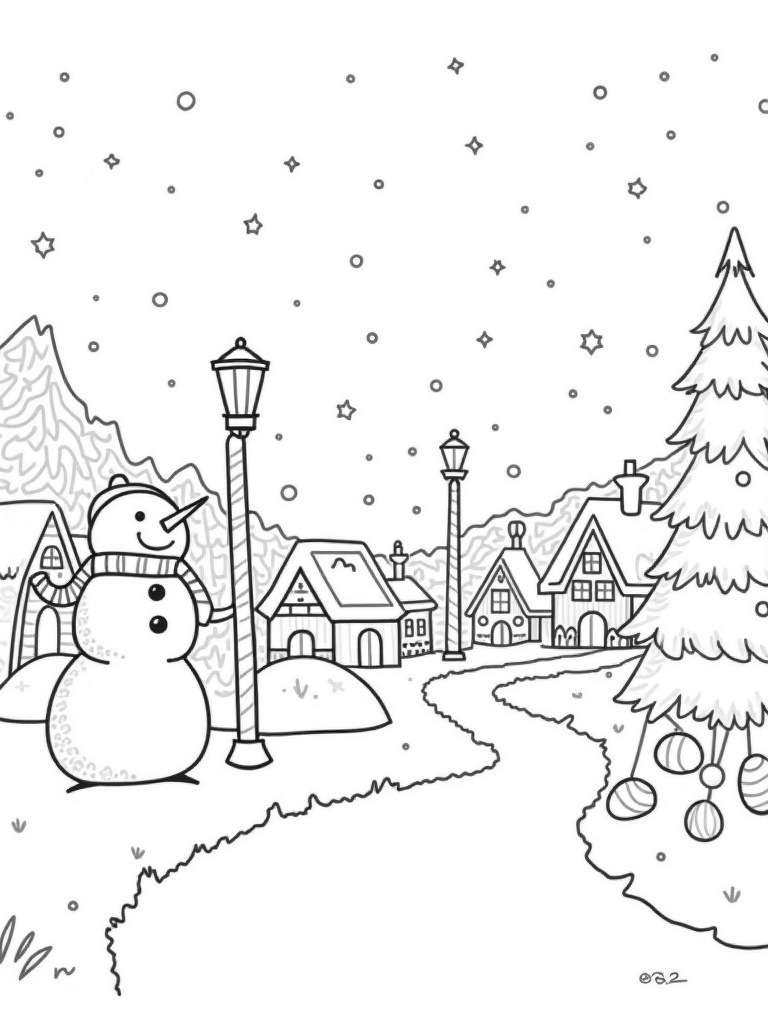 Holiday Village with Gingerbread Houses and Snowman Coloring Page