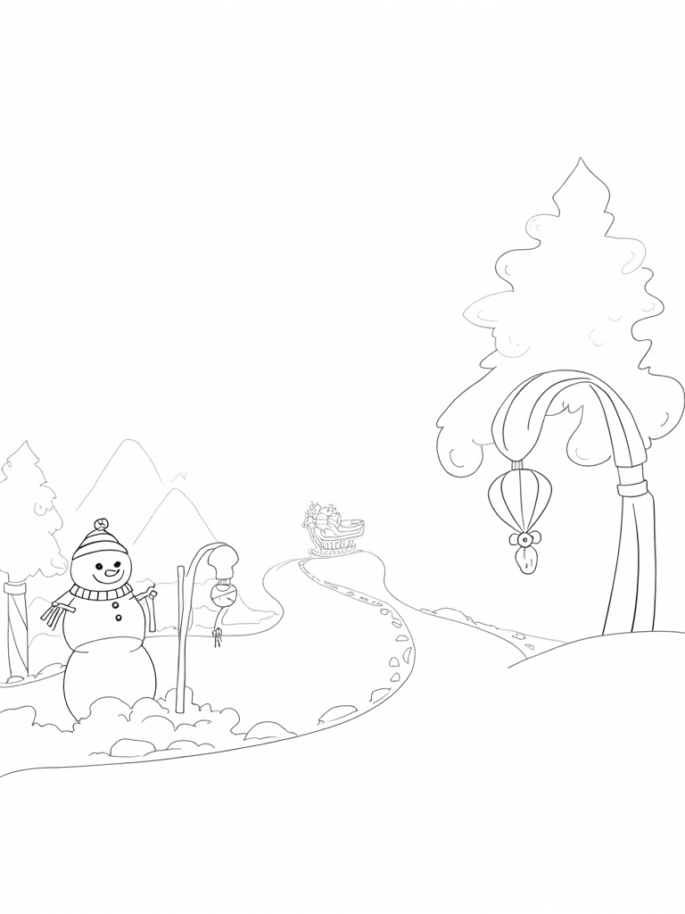 Check out this free, printable coloring page featuring a whimsical winter landscape filled with holiday ornaments, a hot cocoa fountain, and a cheerful snowman. Perfect for holiday fun and creativity!