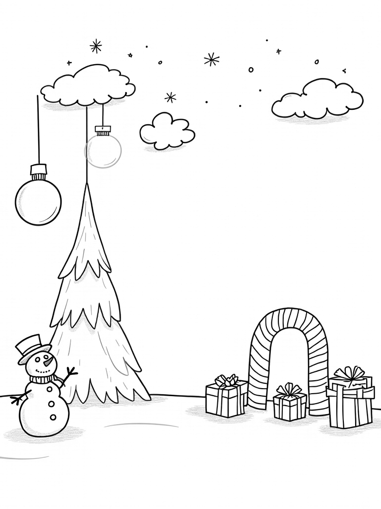 This delightful scene brings to life a charming winter wonderland! You’ll see a sparkling crystalline tree adorned with oversized holiday ornaments, perfect for adding your own splash of color. Right beneath the tree stands a proud snowman, complete with a dapper top hat, and next to him is a giant candy cane archway that looks like it’s straight out of a sweet dream.