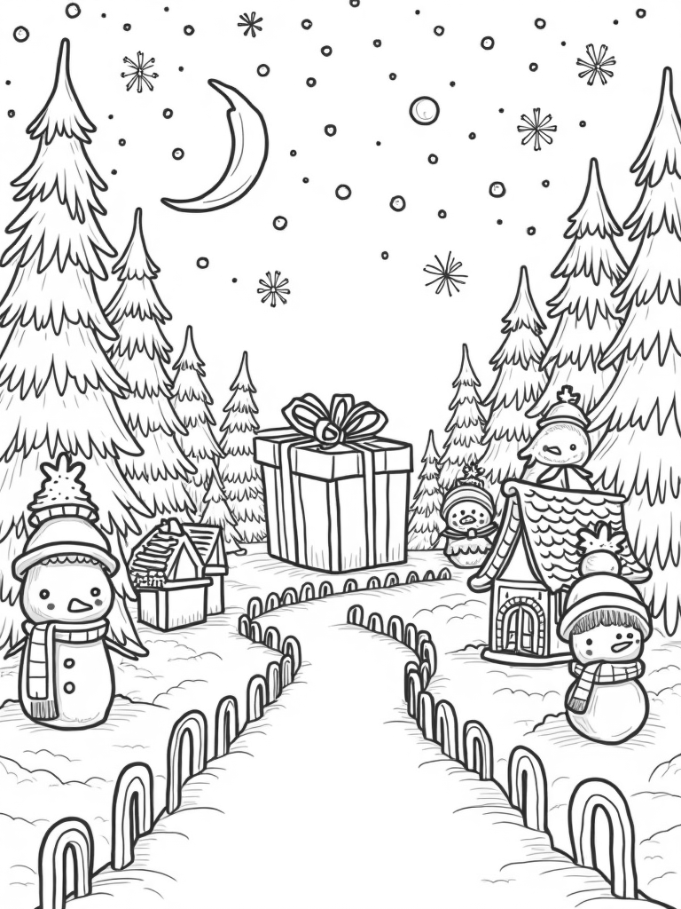 This scene is perfect for kids who love to color! With so many fun elements, from the playful snowmen to the intricate details on the gingerbread houses, there’s plenty to spark creativity. Whether you choose bright colors for the ornaments or classic reds and greens for the candy canes, each choice will bring this winter wonderland to life in your own unique way!