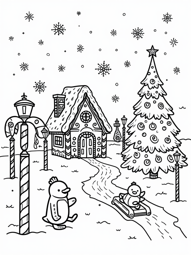 Snowy Holiday Village with Gingerbread House and Penguins Coloring Page