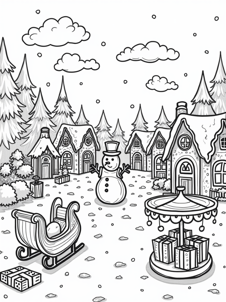 Next to the snowman, there's a colorful sleigh piled high with brightly wrapped presents, just waiting to be opened. A winding path meanders through the village, leading to a merry-go-round decorated with holiday lights that spin gently, casting playful shadows on the snow. Fluffy clouds float above, whimsically shaped like holiday icons, inviting kids to let their imaginations run wild while they color.