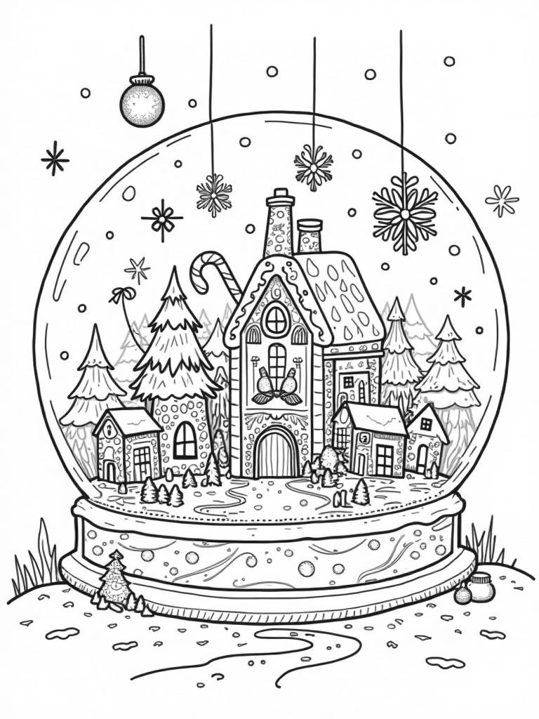 Check out this free, printable coloring page featuring a whimsical winter village inside a snow globe! With a gingerbread house and giant candy canes, it’s perfect for festive fun.