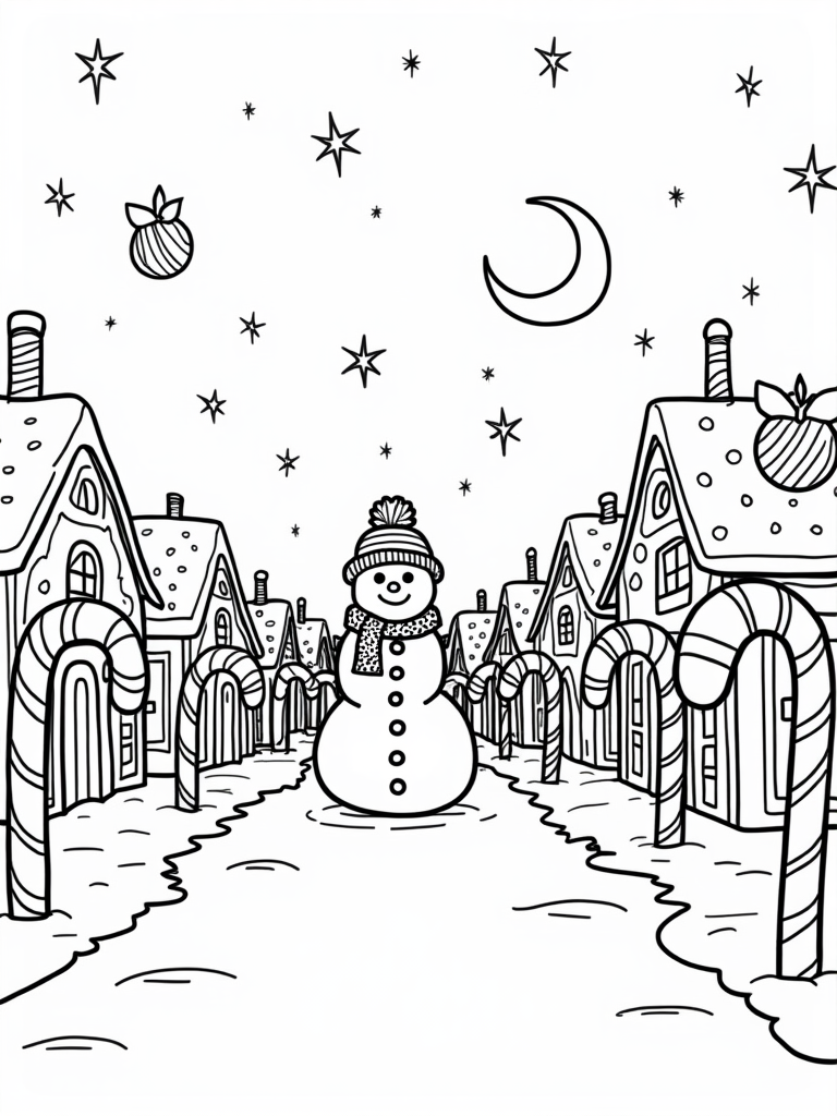 Winter Village with Candy Canes and a Snowman Coloring Page
