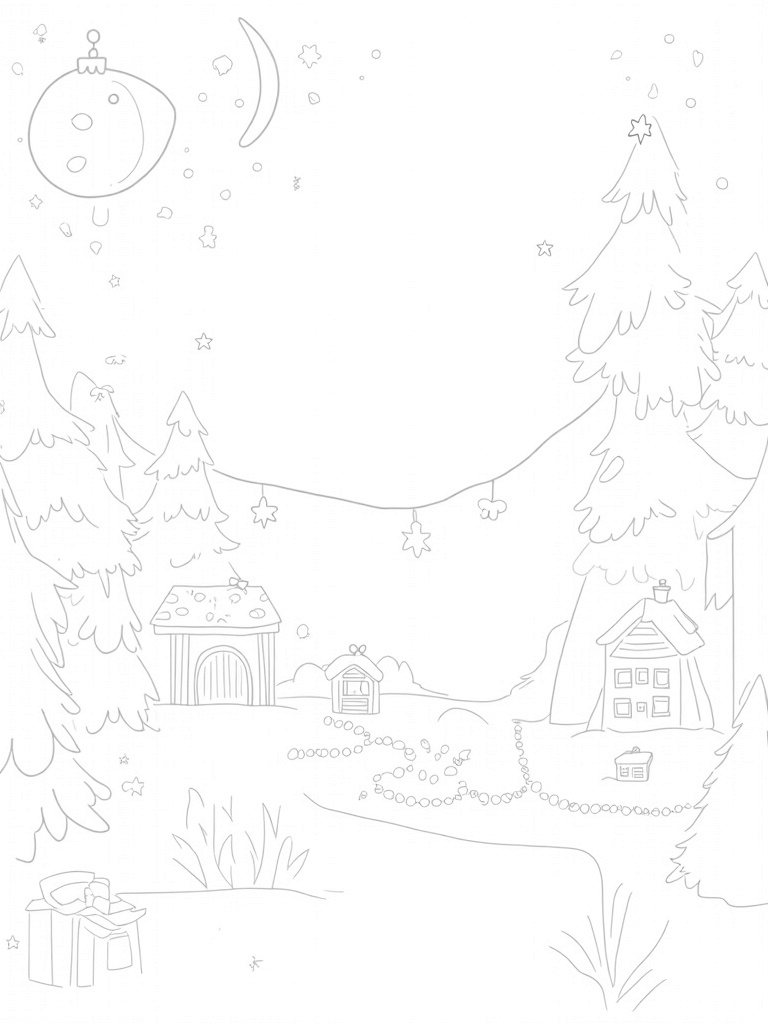Imagine a cozy winter wonderland filled with joy! Towering pine trees are adorned with oversized ornaments that catch the falling snowflakes, making it look like tiny stars are twinkling all around. Below, a charming line of gingerbread houses, each with candy cane chimneys and unique icing patterns, creates a delightful scene along a winding path.