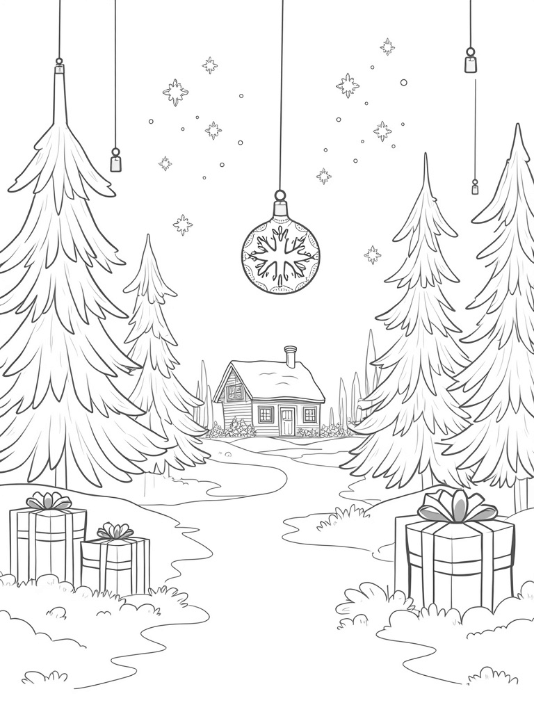 Get ready for a fun coloring experience with this free, printable coloring page featuring a winter wonderland filled with holiday ornaments, gift boxes, and a cozy cabin. Perfect for kids who love the holidays!