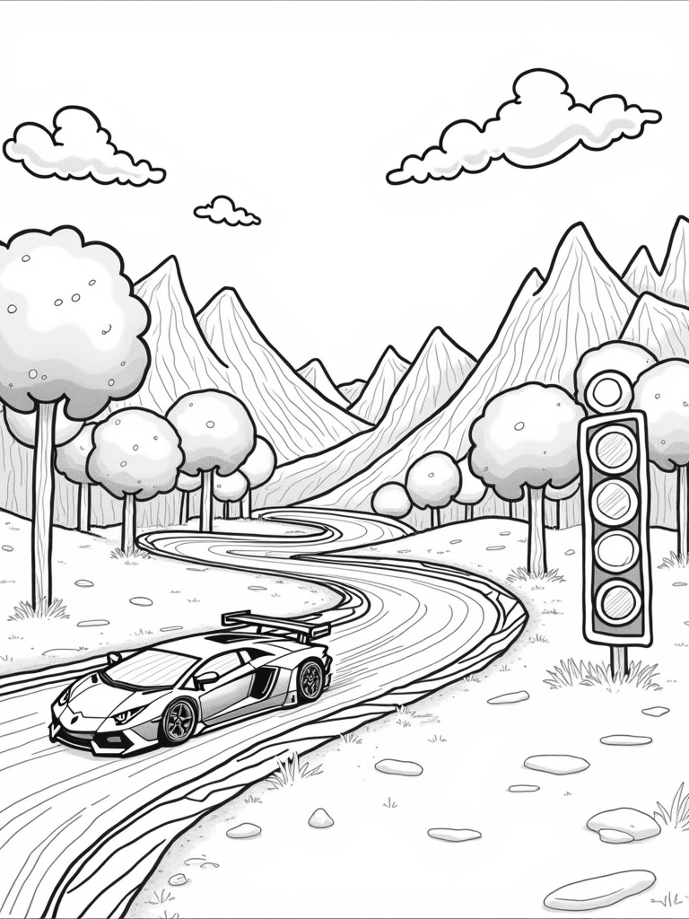 Check out this free, printable coloring page featuring a Lamborghini racing through a candy-colored landscape. Perfect for kids who love cars and sweet treats, this fun design will keep them entertained for hours!