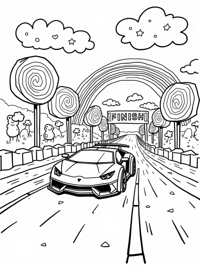Get ready to print this free, printable coloring page featuring a candyland race track with a Lamborghini and waving gummy bears. It's perfect for kids who love sweet adventures and speedy cars!