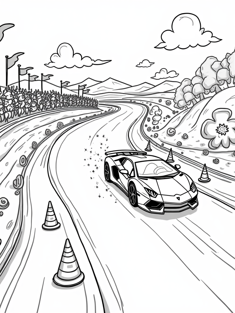Picture a lively racetrack winding through a colorful landscape where fun never stops! On one side, a bunch of cheerful cartoon animals is waving colorful flags, cheering for their favorite racer. On the other side, huge flowers bloom in all the colors of the rainbow, making the whole scene pop with joy. And right in the center, you’ll spot a shiny Lamborghini zooming by, leaving a magical trail of sparkles behind it. How cool is that?