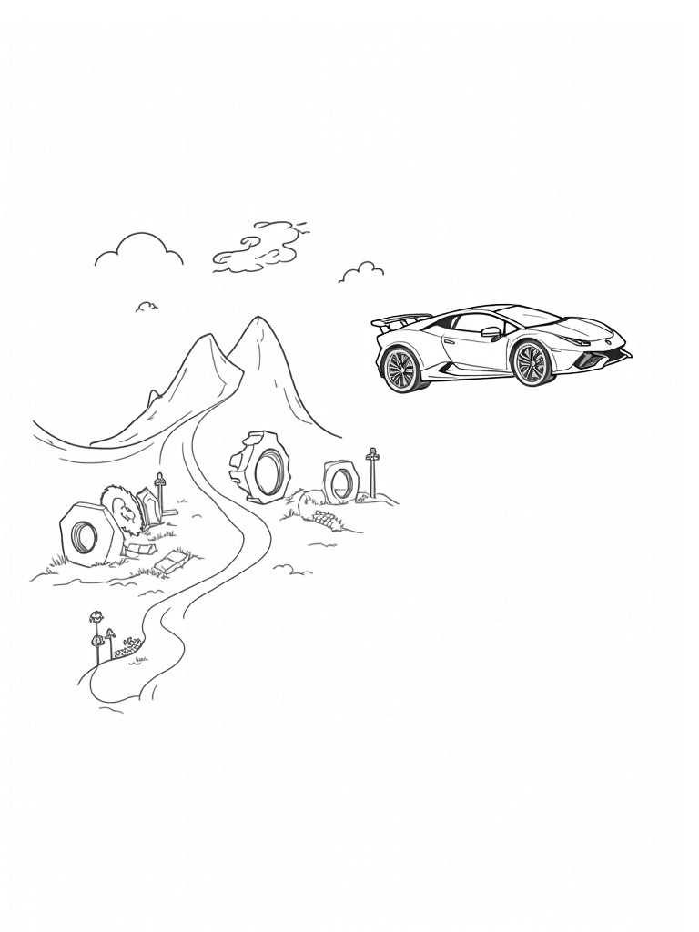 This stunning coloring page shows a sleek, futuristic Lamborghini floating gracefully above a colorful cityscape. The sunset casts these amazing hues across the sky, reflecting off the car's sharp lines. Below, a winding road spirals up a mountain, surrounded by gigantic gear sculptures and oversized tires turned into quirky planters. It's a blend of speed and creativity!