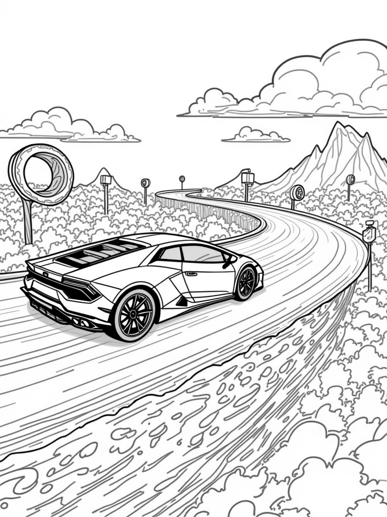 Floating Lamborghini Over a Colorful Racetrack Coloring Page