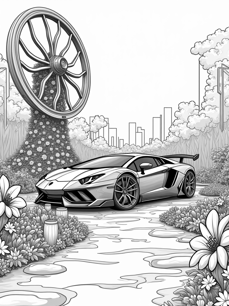 Futuristic Automotive Garden with Lamborghini Chassis Coloring Page