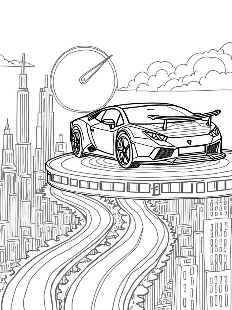 Futuristic City with a Lamborghini on a Floating Platform Coloring Page