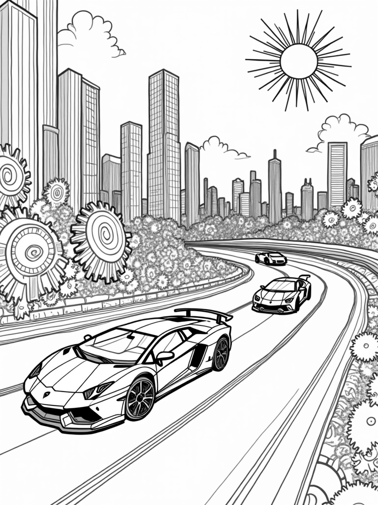 Futuristic City with Lamborghini Silhouettes Coloring Page