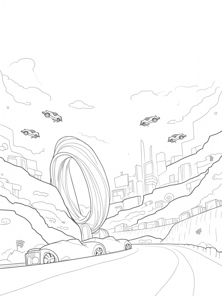Futuristic City with Lamborghini Silhouettes and Neon Lights Coloring Page
