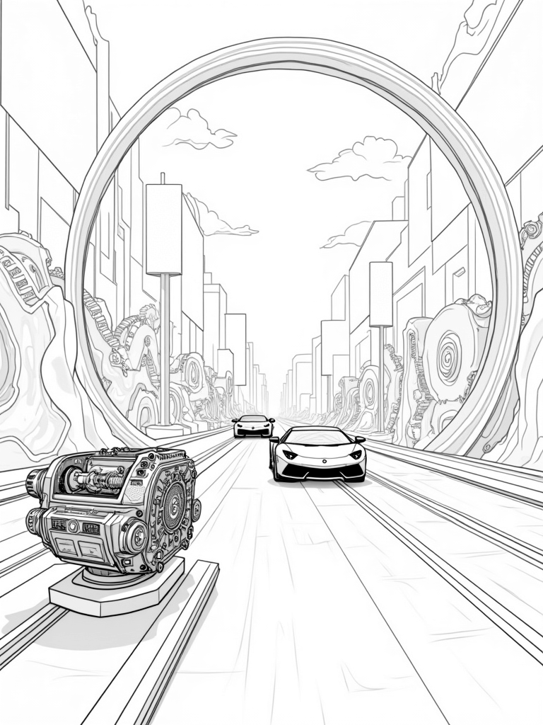 Futuristic City with Lamborghini Silhouettes and Neon Tunnels Coloring Page