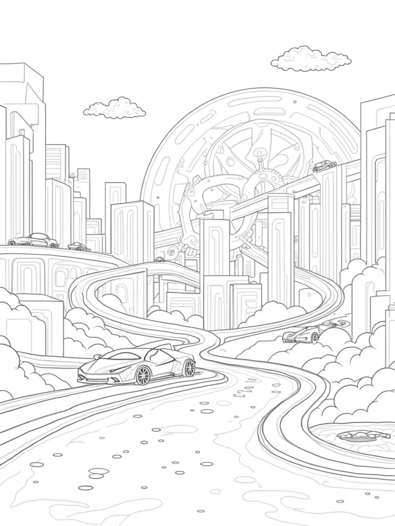 Futuristic City with Lamborghinis and Neon Lights Coloring Page