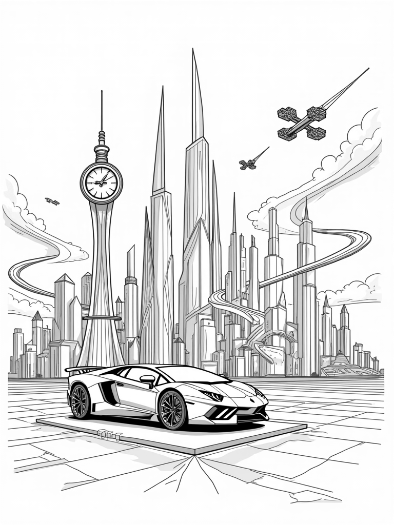 Futuristic Cityscape with Lamborghini and Gear-Shaped Clock Coloring Page
