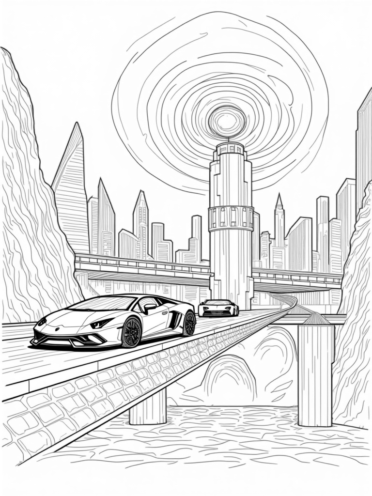 Futuristic Cityscape with Lamborghini Cars Coloring Page