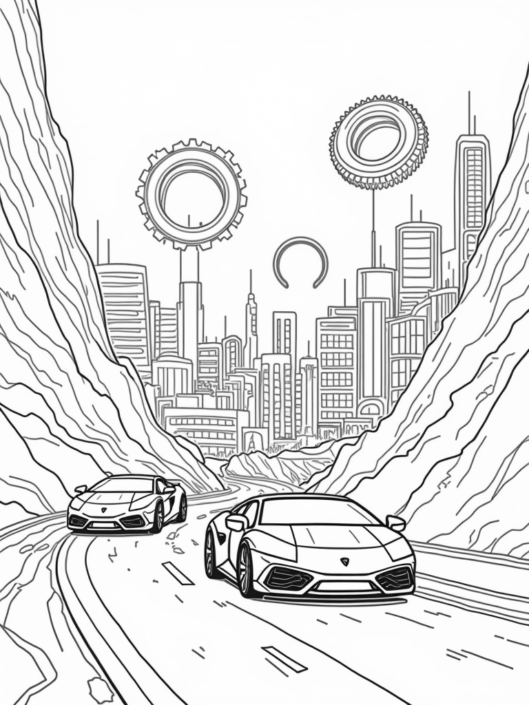 Futuristic Cityscape with Lamborghini Silhouettes Coloring Page