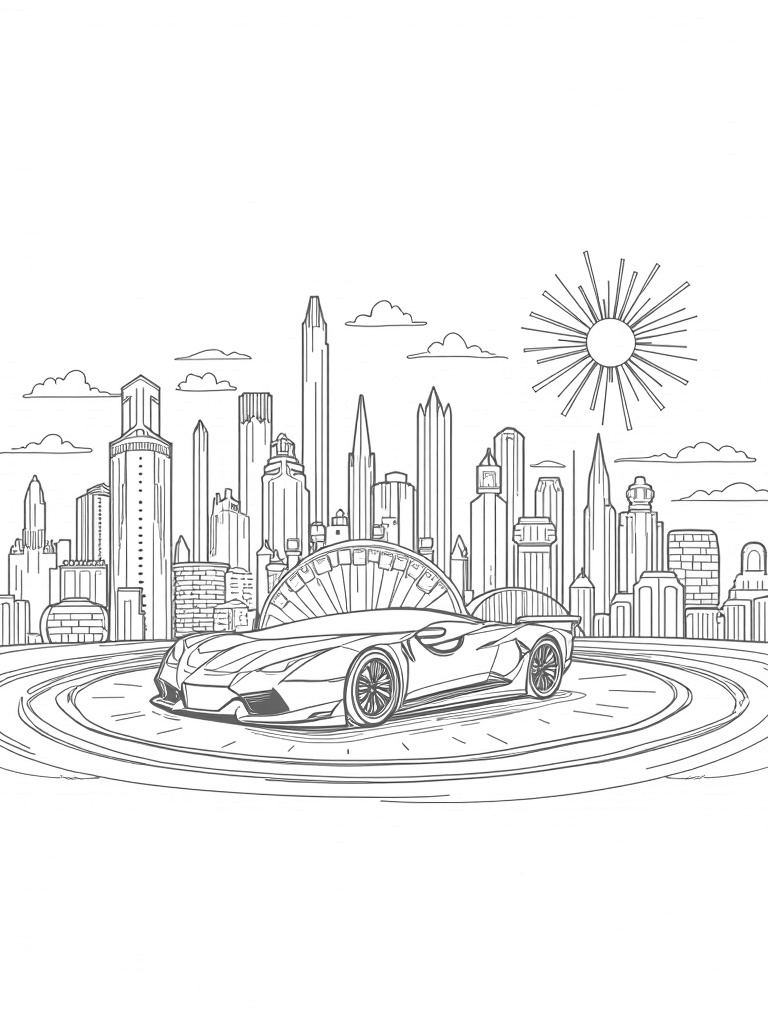 Futuristic Cityscape with Lamborghini Silhouettes Coloring Page