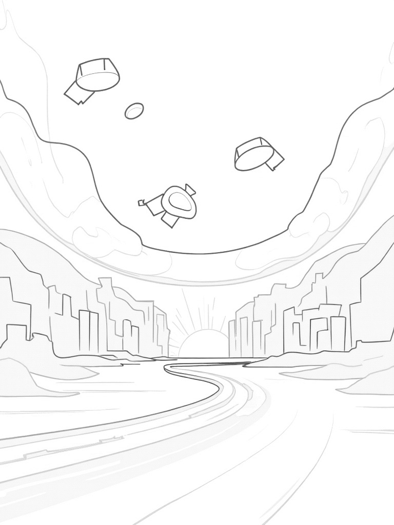 In the foreground, there are oversized tire tracks that create cool patterns on the ground. And check out the sun-shaped emblem glowing in the distance, casting dynamic shadows. This coloring page is perfect for kids who love cars, technology, and vibrant colors!