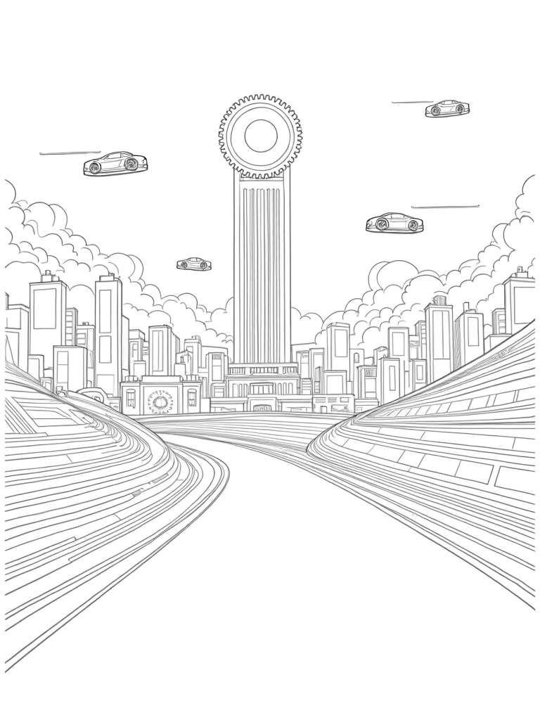 On the racetrack, oversized wheels and tire treads create fun patterns just waiting for your favorite colors. At the center, there's a giant gear tower, full of intricate cogs and mechanisms that look like they could spring to life. And don’t miss the stylized clouds floating in the background, filled with geometric shapes that add an extra layer of excitement. Let your creativity run wild as you fill this futuristic scene with color!