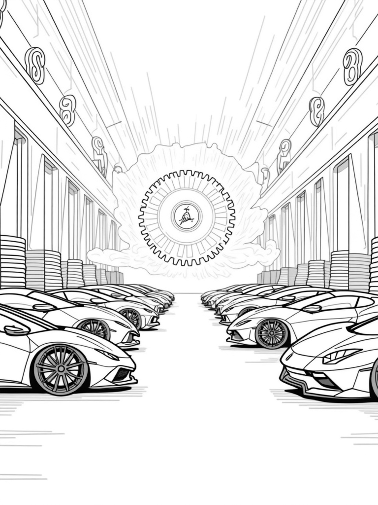 Check out this incredible futuristic garage filled with sleek Lamborghini silhouettes! Each car is bursting with vibrant colors, just waiting for your creative touch. In the middle, there’s a huge gear that’s not just a gear—it’s a piece of art with intricate patterns. All around this cool focal point are floating tire stacks that look like fluffy clouds. It’s a fun mix of speed and imagination!
