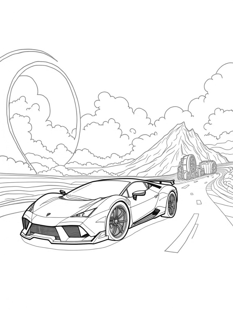 This page shows an awesome, futuristic Lamborghini zooming out of a shiny chrome tunnel. The car has a sleek design that shines with cool geometric patterns. Above it, the sky is alive with swirling clouds that twist into fun shapes, and racing stripes stretch across the horizon like a colorful road, making it feel like a real racetrack!