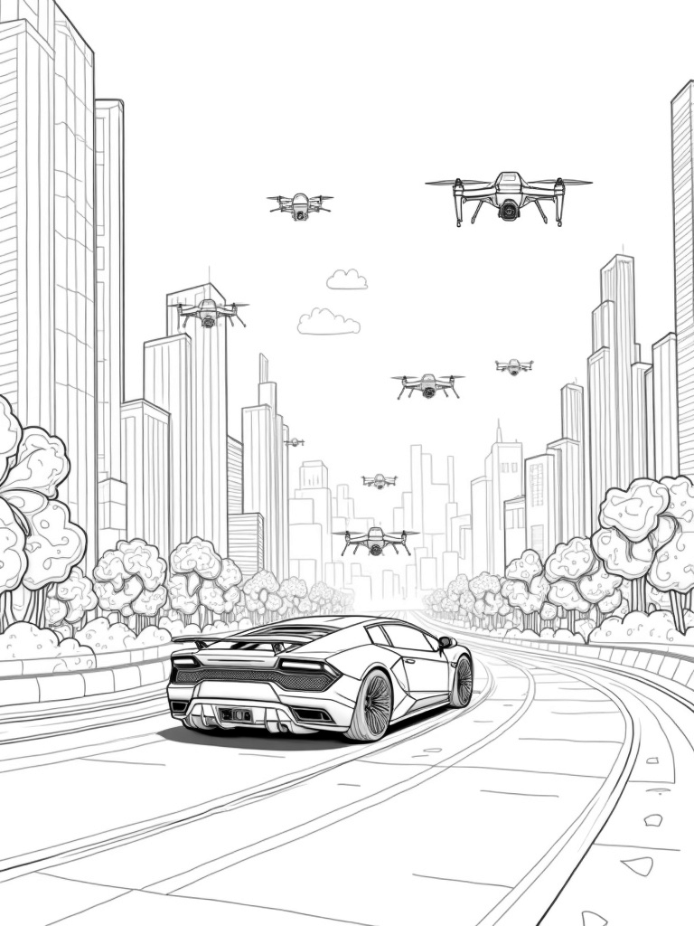 Look up and you’ll see flying drones that look just like streamlined sports cars! They glide through the shimmering skyline, casting playful shadows on the asphalt below. This scene is bursting with energy and excitement—perfect for kids who love cars and futuristic designs!
