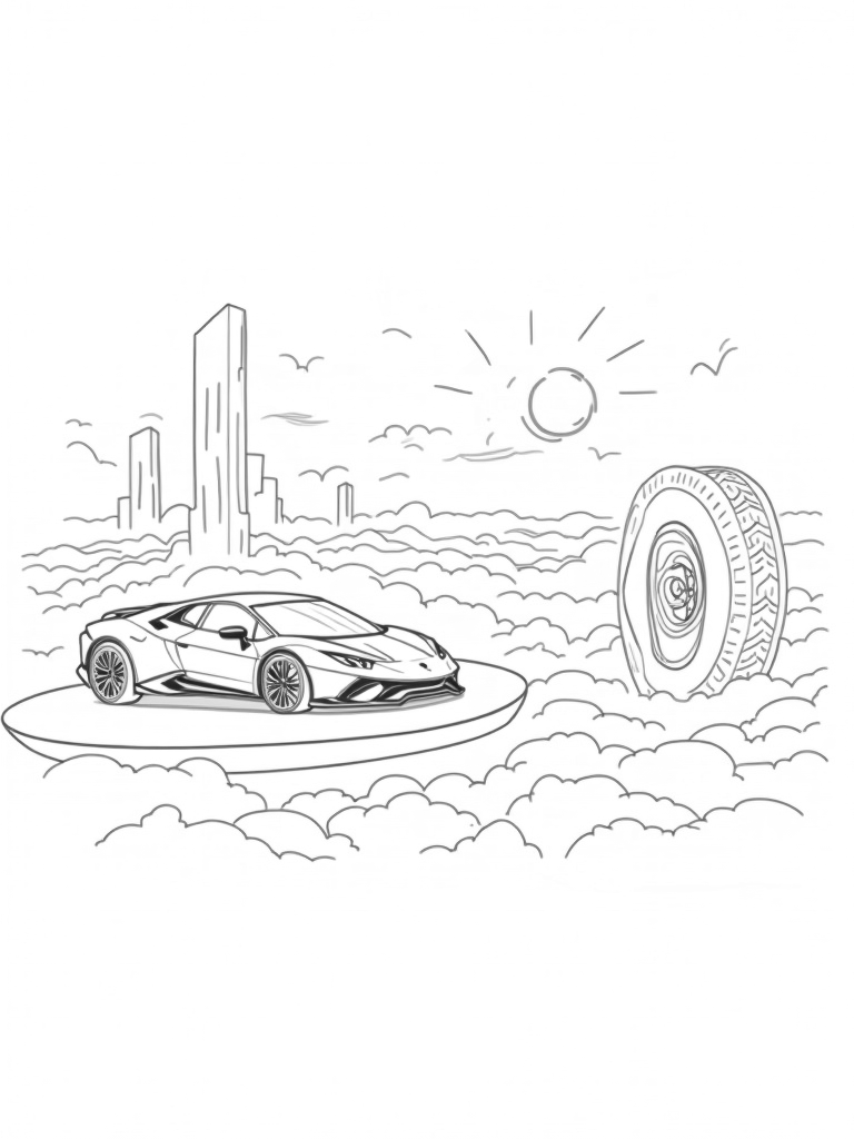 Imagine a sleek, futuristic Lamborghini parked on a floating platform high above a sea of fluffy clouds. The car’s sharp lines stand out against the swirling, vibrant colors below, where abstract shapes dance like waves. Towering geometric structures rise from the clouds, reflecting the car's shiny finish, making it look even cooler!