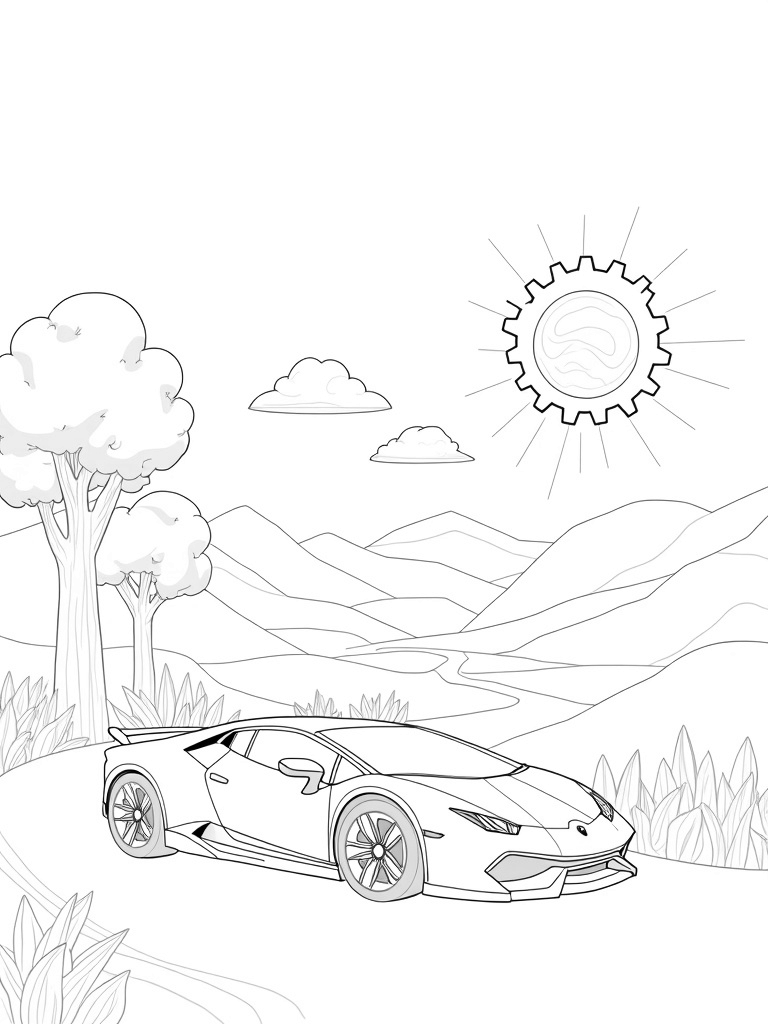 The sky above is anything but ordinary. Bold, abstract clouds drift in unusual shapes, casting fun shadows on the ground. And just when you thought it couldn't get cooler, there's a giant gear-shaped sun shining down, sending out rays that look like racing stripes. It’s like a dream for car lovers and nature fans alike!