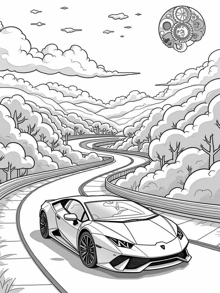 This is your chance to bring the whole picture to life with your favorite colors! Imagine the Lamborghini in your favorite shades, or give the trees and hills a wild, colorful twist. Don’t forget the sun made of cogs—it’s just waiting for your artistic touch!